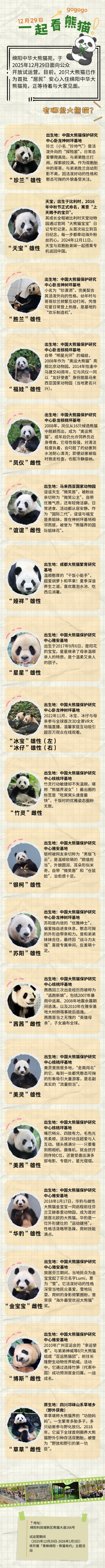 当今,这里的首批“新房民”共有4只老年个体、12只成年个体及4只亚成体,年齿跨度从4岁至27岁,包括旅居北欧转头的“华豹”“金宝宝”、网红“超模熊猫”冰宝、奥运明星“福娃”及“功勋姆妈”草草等明星大熊猫。
